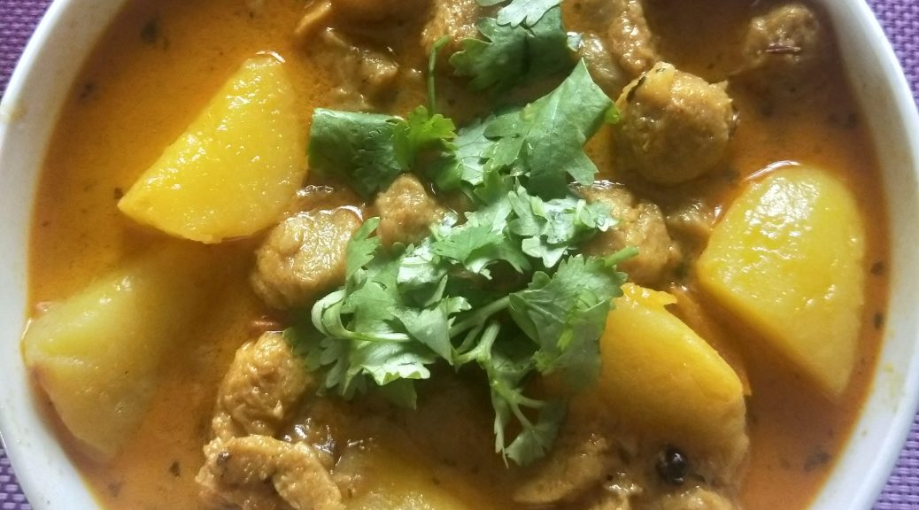 First of all boil water and add the soya chunks till it gets soft. Now wash the soya chunks with water and squeez the water and keep it aside.Before starting cooking, take a bowl and add ginger green chilli paste , all the dry masala powder, sugar and salt and also some water and make a masala paste of all. Take a kadai, add oil into it and let it become hot..Now add the cubed potatoes and fry till golden brown and then add the soya chunks too for frying sometime. In the same kadai add oil , whole cumin seeds, whole garam masala and bayleaf. Now add tomato pieces , fry till oil leaves. Now add masala paste into it, cook until oil seperates. Now add fried potato and soya chunks into it with some sprinkle of water. Cook nicely for 5 minutes and then add one cup of hot water into it, cover with a lid and let it boil. Check if its cook well take a small pan add ghee and hing and add it into the curry and let it boil for another two minutes. Now add freshly chopped coriander leaves on top. Enjoy with your loved ones this delicious soya chunks recipe and share your comments in the comment box.